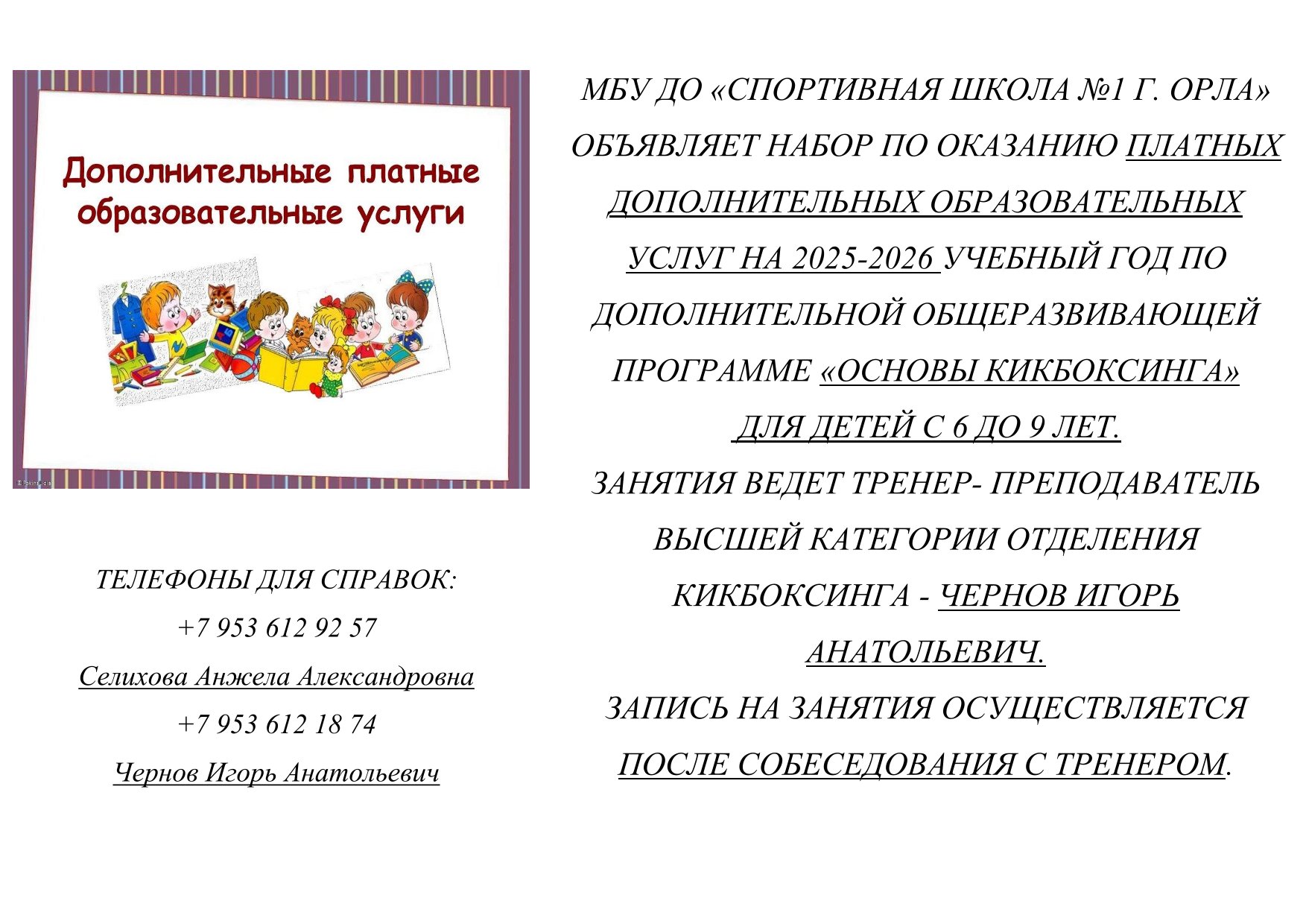 МБУ ДО «СПОРТИВНАЯ ШКОЛА №1 Г. ОРЛА» ОБЪЯВЛЯЕТ НАБОР ПО ОКАЗАНИЮ ПЛАТНЫХ ДОПОЛНИТЕЛЬНЫХ ОБРАЗОВАТЕЛЬНЫХ УСЛУГ НА 2025-2026 УЧЕБНЫЙ ГОД ПО ДОПОЛНИТЕЛЬНОЙ ОБЩЕРАЗВИВАЮЩЕЙ ПРОГРАММЕ «ОСНОВЫ КИКБОКСИНГА» ДЛЯ ДЕТЕЙ С 6 ДО 9 ЛЕТ. ЗАНЯТИЯ ВЕДЕТ ТРЕНЕР- ПРЕПОДАВАТЕЛЬ ВЫСШЕЙ КАТЕГОРИИ ОТДЕЛЕНИЯ КИКБОКСИНГА - ЧЕРНОВ ИГОРЬ АНАТОЛЬЕВИЧ. ЗАПИСЬ НА ЗАНЯТИЯ ОСУЩЕСТВЛЯЕТСЯ ПОСЛЕ СОБЕСЕДОВАНИЯ С ТРЕНЕРОМ. ТЕЛЕФОНЫ ДЛЯ СПРАВОК: +7 953 612 92 57 Селихова Анжела Александровна +7 953 612 18 74 Чернов Игорь Анатольевич